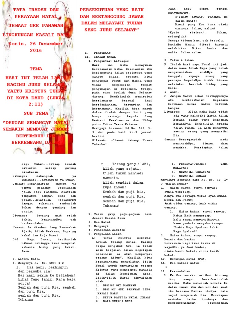 Tata ibadah perayaan natal oikumenedeskripsi lengkap. Pemberkatan nikah, tata ibadah adven natal prapaskah dan paskah. Wahai tuhan, pencipta semesta ! Tata ibadah malam natal keluarga (di rumah) 1. Prolog dari pemuda pujian dari pemudapanggilan beribadah :pemuda 1 (engel) :